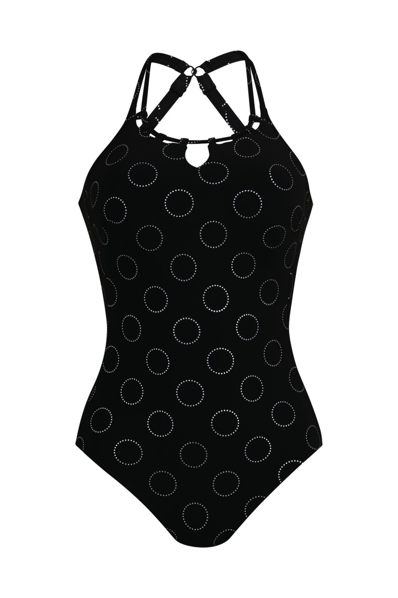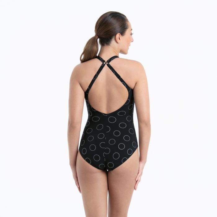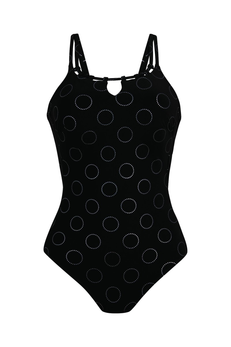 Το μαγιό μαστεκτομής Bari φέρνει ξέγνοιαστες μέρες στην παραλία. Σπορ και κομψό με πολύ υψηλό ντεκολτέ και ρυθμιζόμενες τιράντες. Κύκλοι σε διακριτικό ασημί δίνουν στο μαύρο φόντο πιο πολυτελή εμφάνιση. Εξαιρετική ποσότητα lycra, στεγνώνει γλήγορα, έχει θήκες κ από τις δυο πλευρές για την τοποθέτηση του πρόσθετου μαστού.