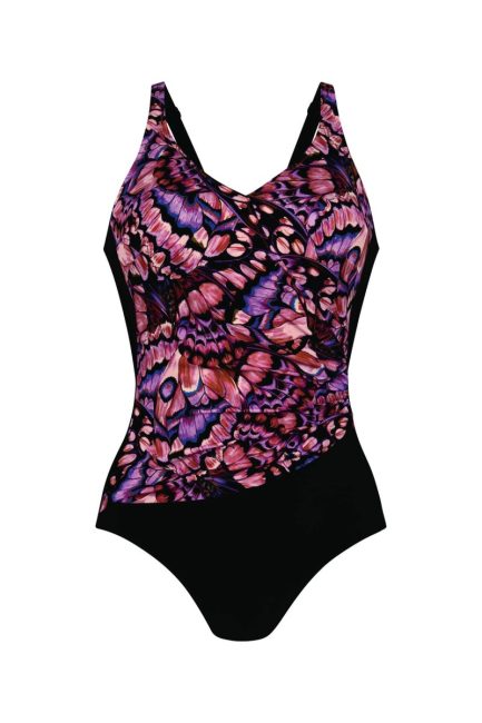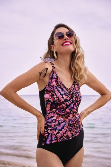 Κολακευτικό και μοντέρνο, άνετο ΟΛΟΣΩΜΟ μαγιό μαστεκτομής από τη σειρά Retro Butterfly, με ζωηρά χρώματα. Οι ειδικά σχεδιασμένες και φοδραρισμένες θήκες του κρατούν σωστά την πρόθεση τους στήθους στην θέση της και εξασφαλίζει ελευθερία κινήσεων. Ρυθμιζόμενες, απαλές τιράντες στην πλάτη δεν πληγώνουν τους ώμους. Κλασσικό κόψιμο στους μηρούς. Lycra Xtra life.