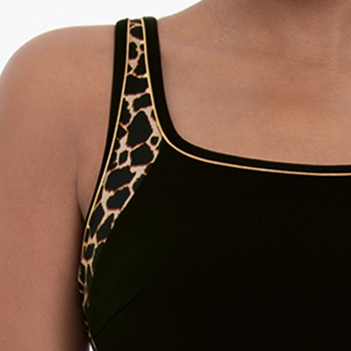 Ολόσωμο μαγιό μαστεκτομής, χωρίς μπανέλες, με θήκες και στις δυο πλευρές. Είτε για κολύμπι είτε για χαλάρωση, με καφέ animal print λεπτομέρειες στα πλαϊνά. Ανθεκτικό στο χλώριο της πισίνας, στεγνώνει γρήγορα, έχει ρυθμιζόμενες τιράντες.